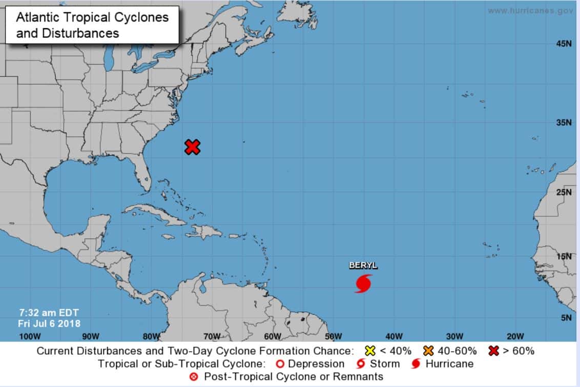 Hurricane Beryl has become our second named storm of the 2018 Atlantic hurricane season! The system will encounter conditions favorable for strengthening over the next day or so and then likely weaken to tropical storm status as it approaches the central Lesser Antilles late Sunday. Stormy conditions may be felt anywhere from St. Lucia, Martinique, Dominica, Guadeloupe and Antigua to the Virgin Islands, Puerto Rico and parts of Hispaniola