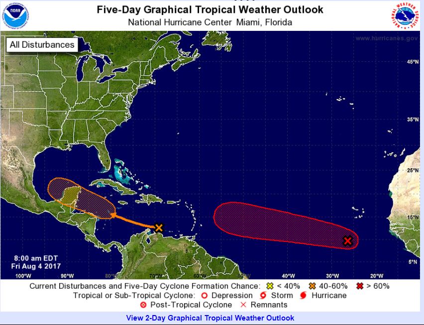 The National Hurricane Center designated 99L yesterday and is predicting an 80% chance that the disturbance will reach cyclone status in the next five days. In addition, we have another disturbance in the central and eastern Caribbean sea with a 60% chance of development.